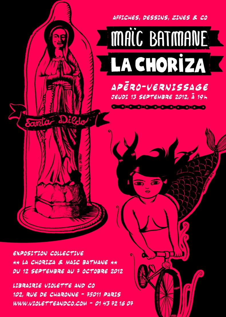 Bon, sinon, à part ça et tout et tout, dans l’ChériBibi y’a pas que des bonshommes, y’a aussi des bonnes femmes… Pis parmi elles, y’a la miss Sapitoverde dont l’zine La Choriza a vachement plus la pêche que moi vu ses cadences de sortie. Pis là elle fait une expo avec une copine de pinceau. Pis si t’y vas pas, t’es un(e) gros(se) naze. D’abord. Même que.