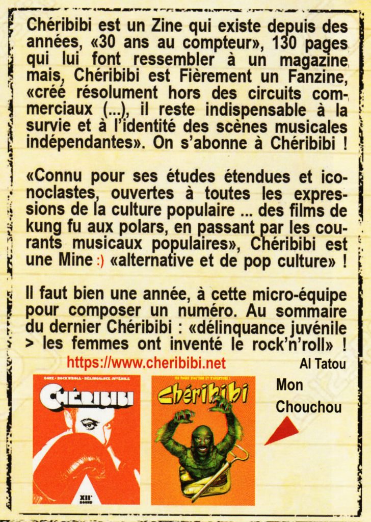 Chéribibi est un fanzine français qui est venu fêter ses 31 ans en 2022 au cinéma nova, l’occasion que la fanzino récupère un petit stock des numéros qui n’ont pas été écoulé. Depuis 12 ans devenu annuel avec double/triple thématique, son format s’est stabilisé. De par sa ténacité, sa qualité, son ton ainsi que la gouaille et le franc parlé de son créateur et auteur principal, Daniel, le fanzine reçoit depuis quelques années un échos et une reconnaissance qui lui est dût ! de multiple interview de Daniel existe en radio/fanzine/vidéo pour connaitre mieux toute l’histoire de Chéribib !