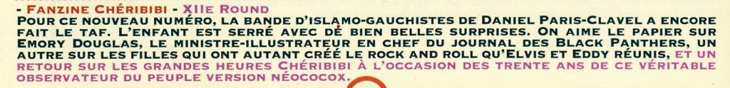 Bon, pour le reste ça reste Chéribibi tel qu’on le connaît et qu’on l’aime (oui, malgré tout) avec chaque page composée de façon improbable, magnifique, rien que pour le plaisir des mirettes, faut feuilleter un jour Chéribibi ! Ça sauve pas tout et ça ne peut pas faire un bon zine, mais bon, un numéro de temps en temps qui me rend pas dingue-dingue, y a pas mort d’homme…