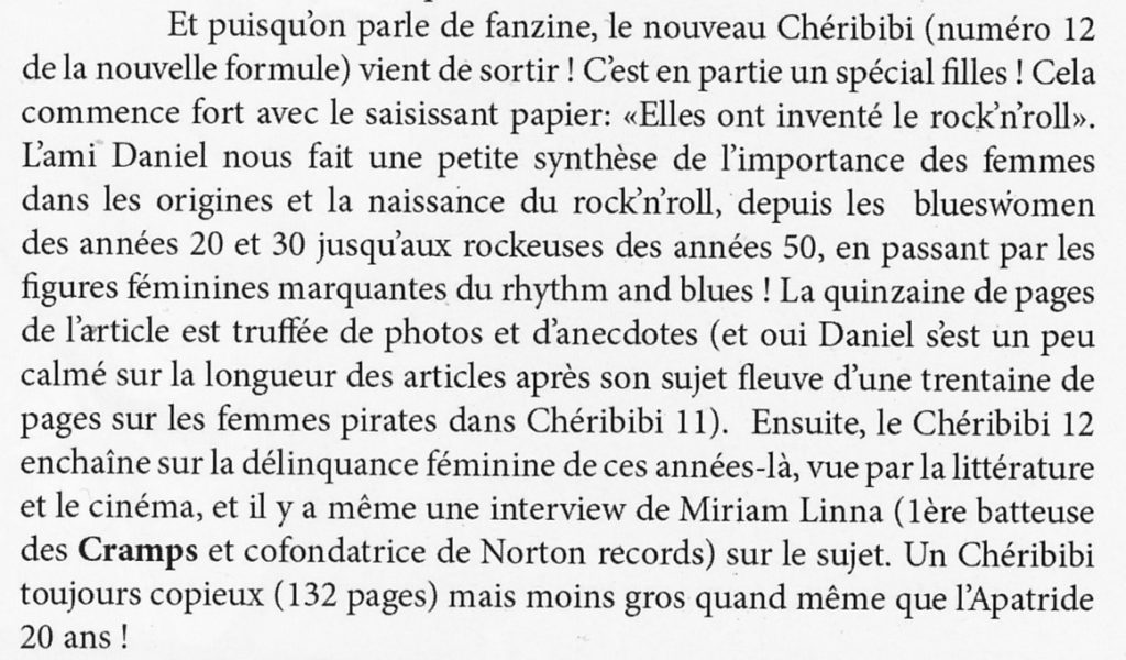 CHÉRIBIBI fête ses 30 piges avec ce numéro 12 de la nouvelle série (N°27 en réalité – bravo Daniel !), avec un sommaire comme toujours hétéroclite (les femmes dans les débuts du rock, les gangs féminins, la boxe en Indonésie et côté punk-hardcore Iron Cross et une rétro des 30 ans) et une mise en page de toute beauté.